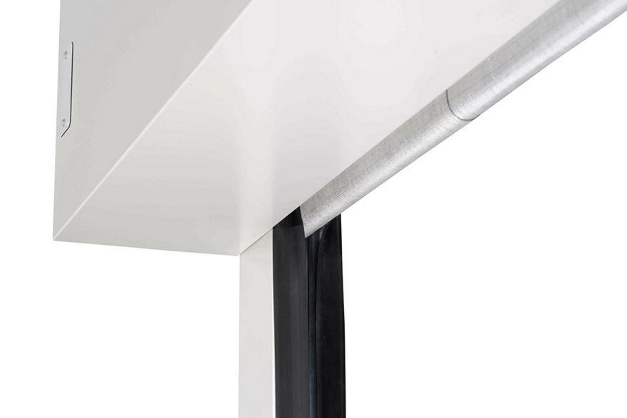 Lindningsaxeln är monterad på väggfästen och sitter skyddad i en axelbox tillverkad av 0,7–1,0 mm galvaniserad stålplåt. Ridåns sidor löper i styrskenor med tvärsnitt 80 × 120 mm, även de av 0,7 mm galvaniserad stålplåt.